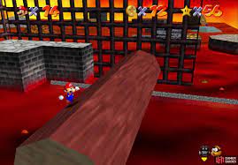 Now your going to the log. all you have to do is be careful, and watch out for the flames that pop out of the lava as they can cause Mario to panic and fall of the platform into the lava and you will have the process of getting this star all over again. Jump on the platform that leads to the log.